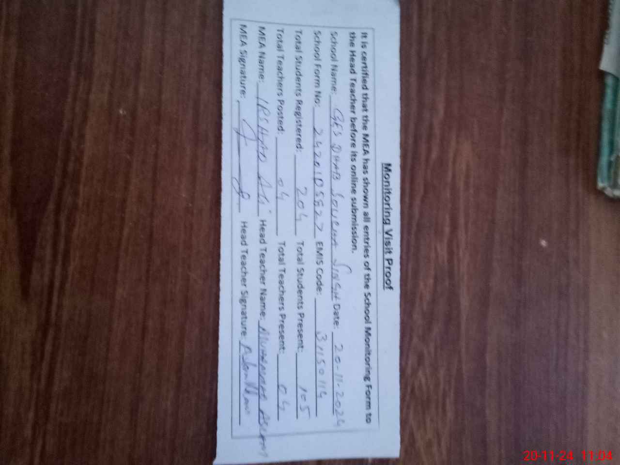 | Attendance Register | Head Teacher | MEA with School | Visit Proof |