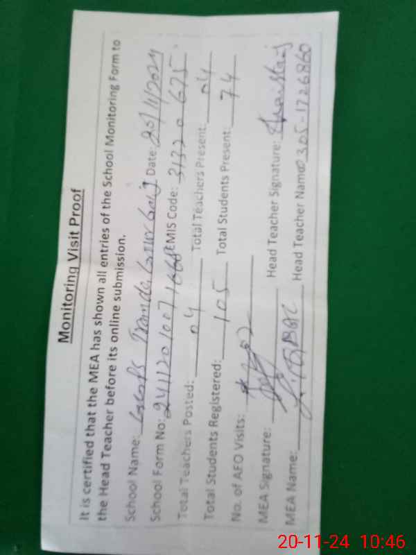 | Attendance Register | Head Teacher | MEA with School | Visit Proof |