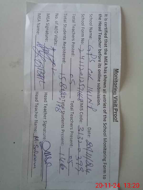 | Attendance Register | Head Teacher | MEA with School | Visit Proof |