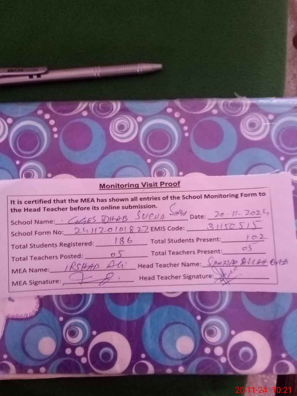 | Attendance Register | Head Teacher | MEA with School | Visit Proof |