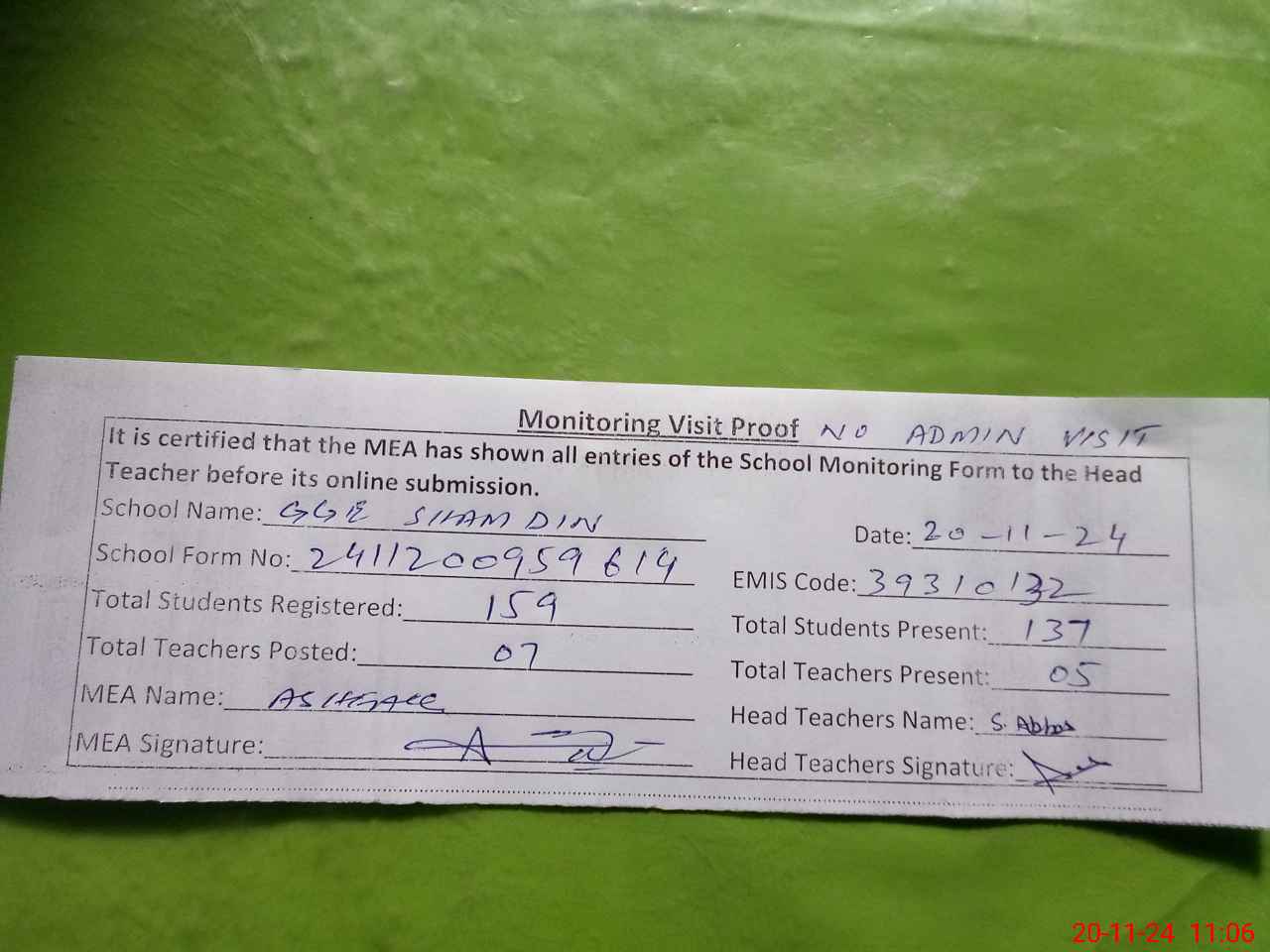 | Attendance Register | Head Teacher | MEA with School | Visit Proof |