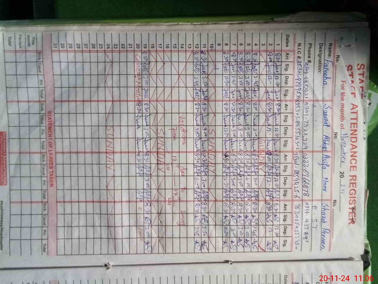 | CNIC | Full Name | Designation | R/C | Absence During Last Calender Month |