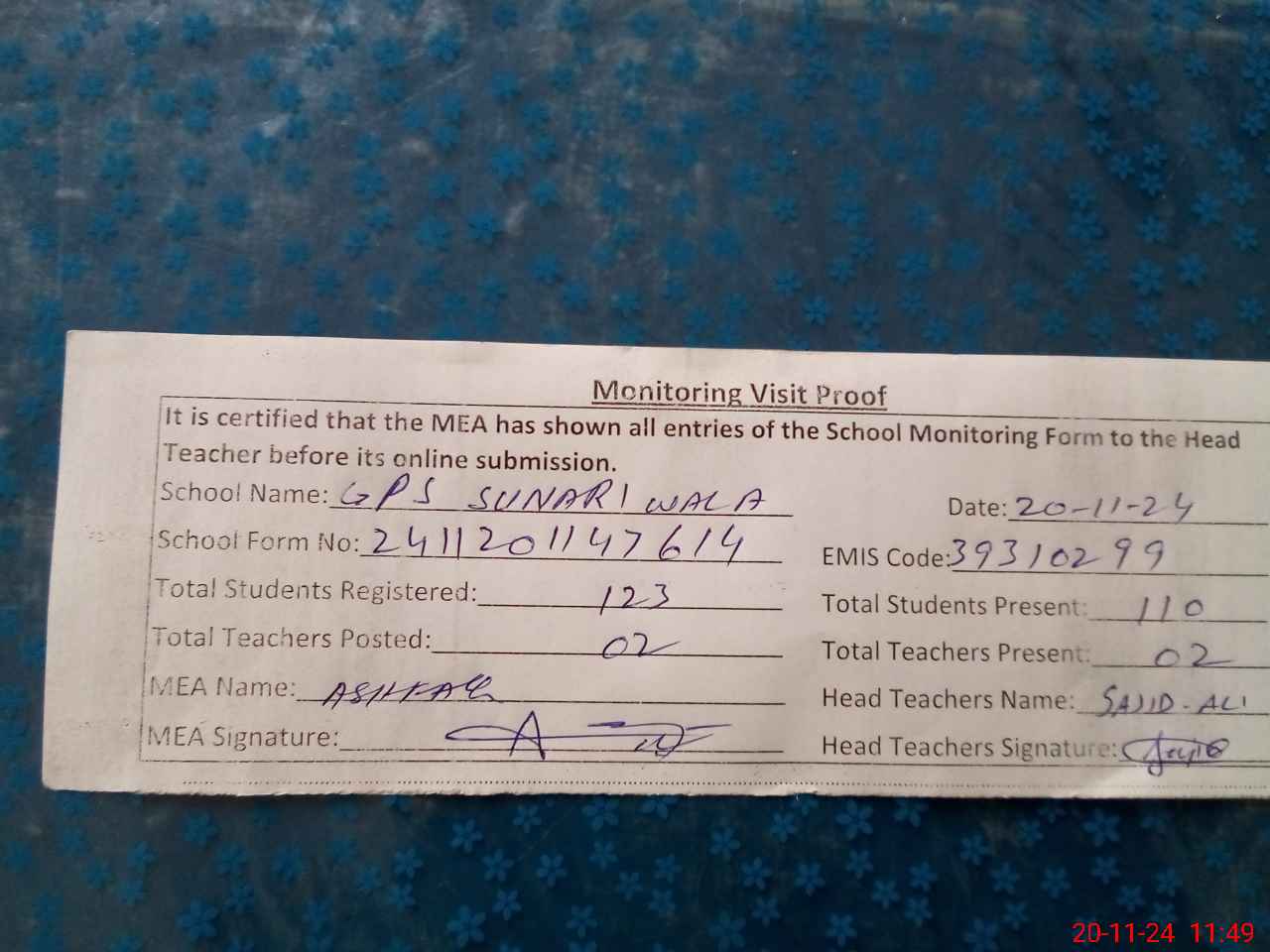 | Attendance Register | Head Teacher | MEA with School | Visit Proof |
