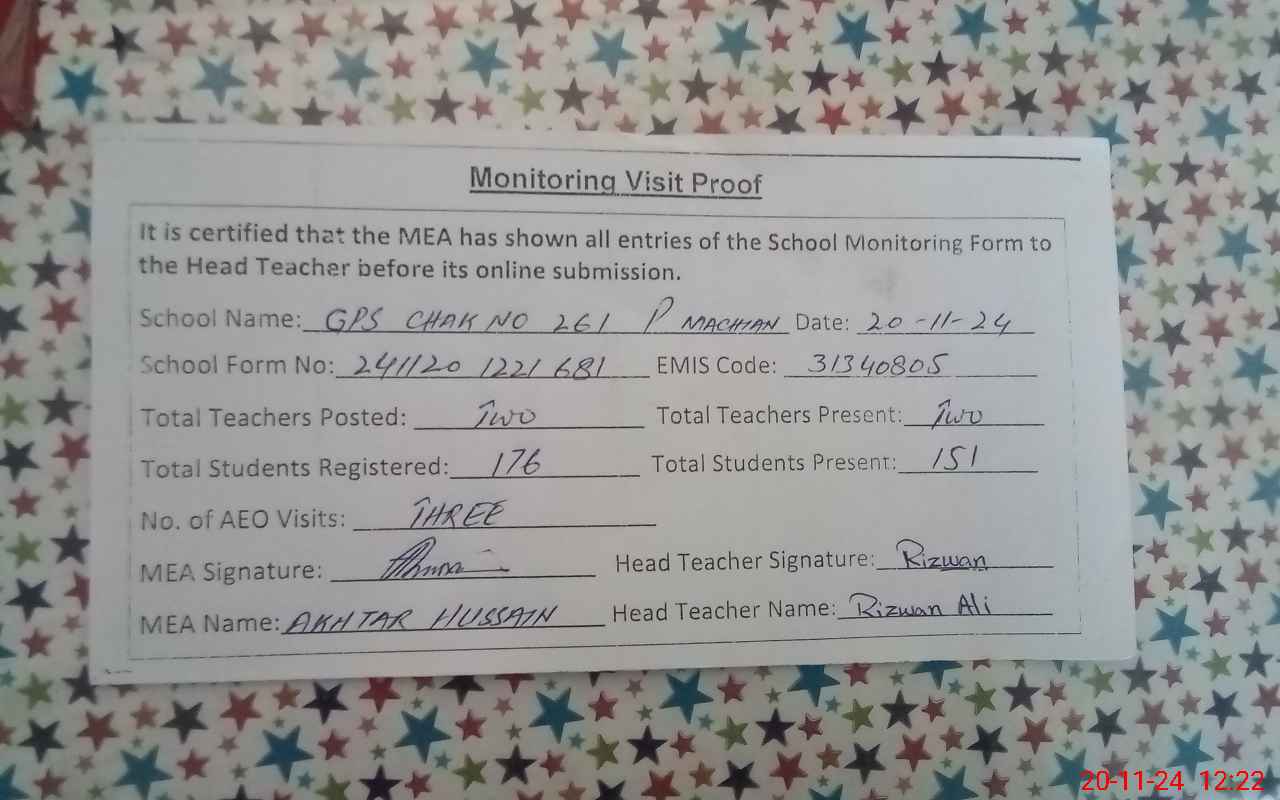 | EMIS Code: 31340805 | Name of School: GPS CHAK NO. 261/P (MACHAIN) | |||