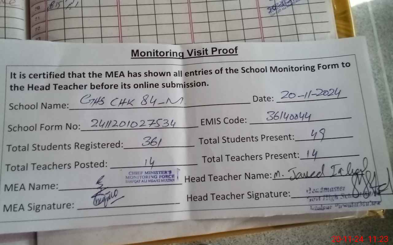 | EMIS Code: 36140044 | Name of School: GHS CHAK 84 / M | |||