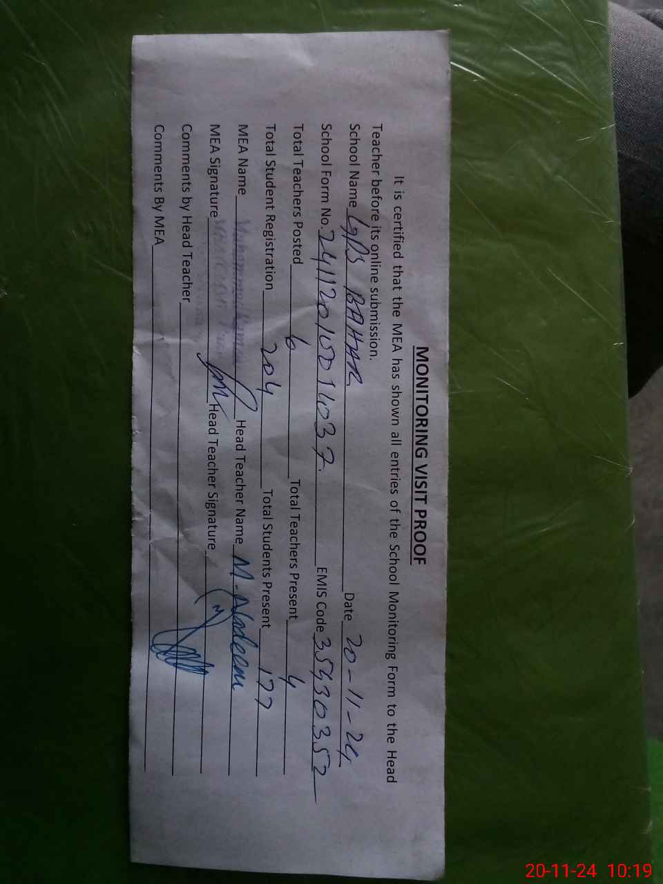 | Attendance Register | Head Teacher | MEA with School | Visit Proof |