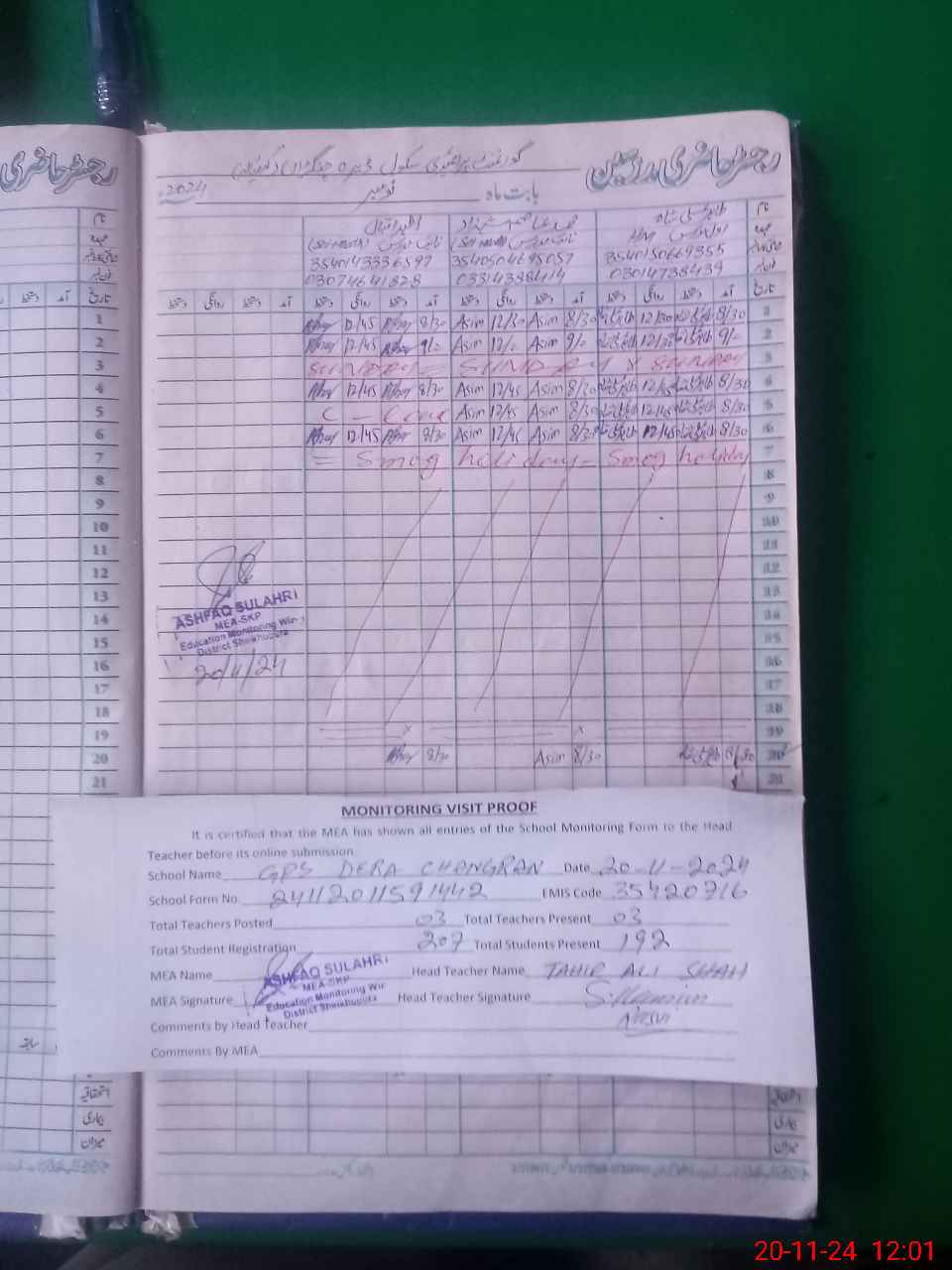 | Attendance Register | Head Teacher | MEA with School | Visit Proof |