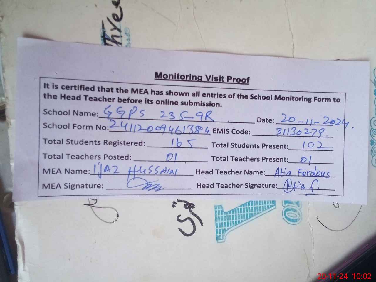 | Attendance Register | Head Teacher | MEA with School | Visit Proof |