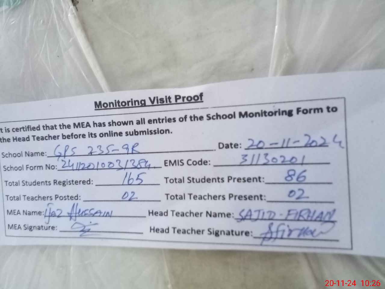 | Attendance Register | Head Teacher | MEA with School | Visit Proof |