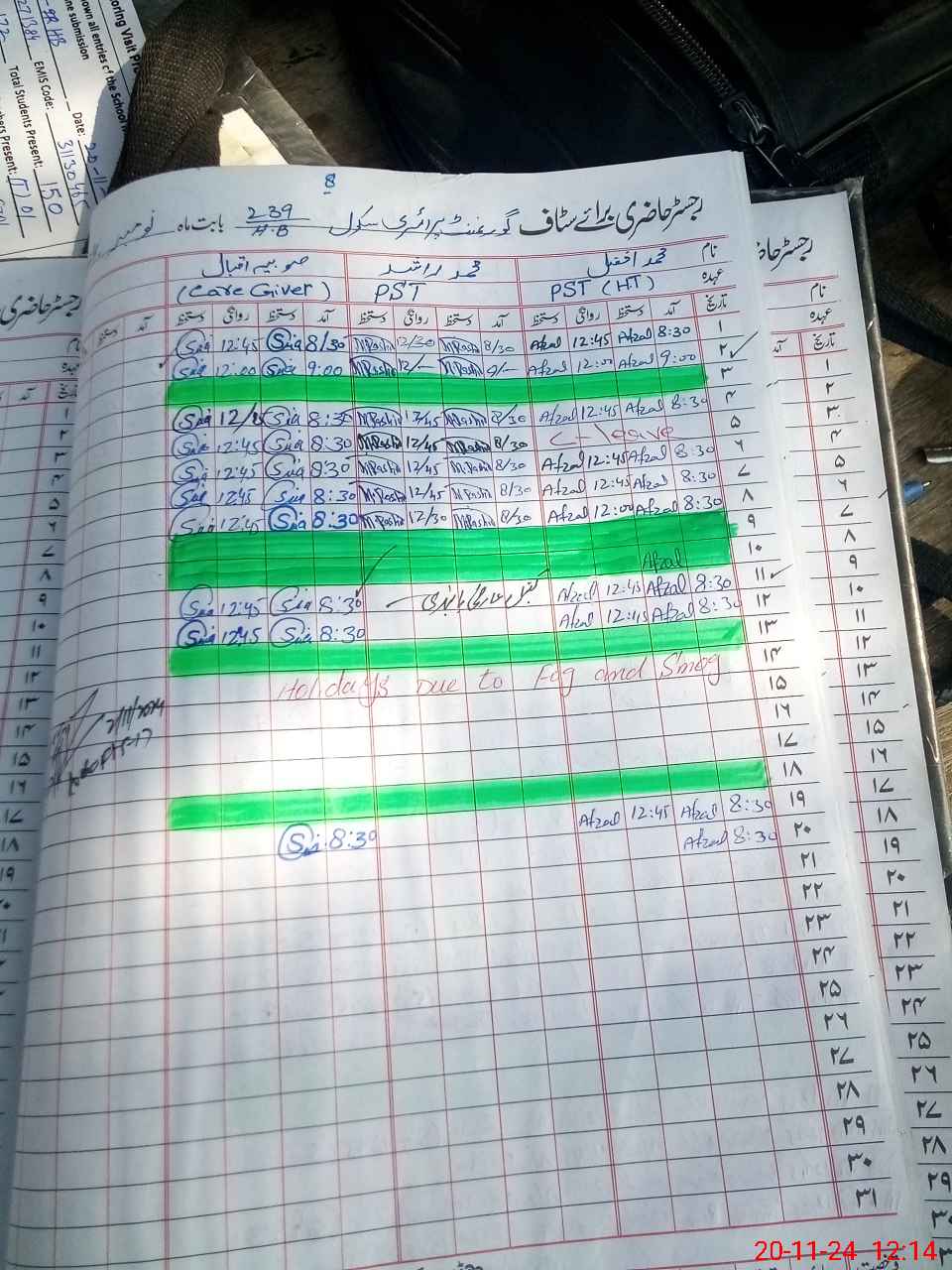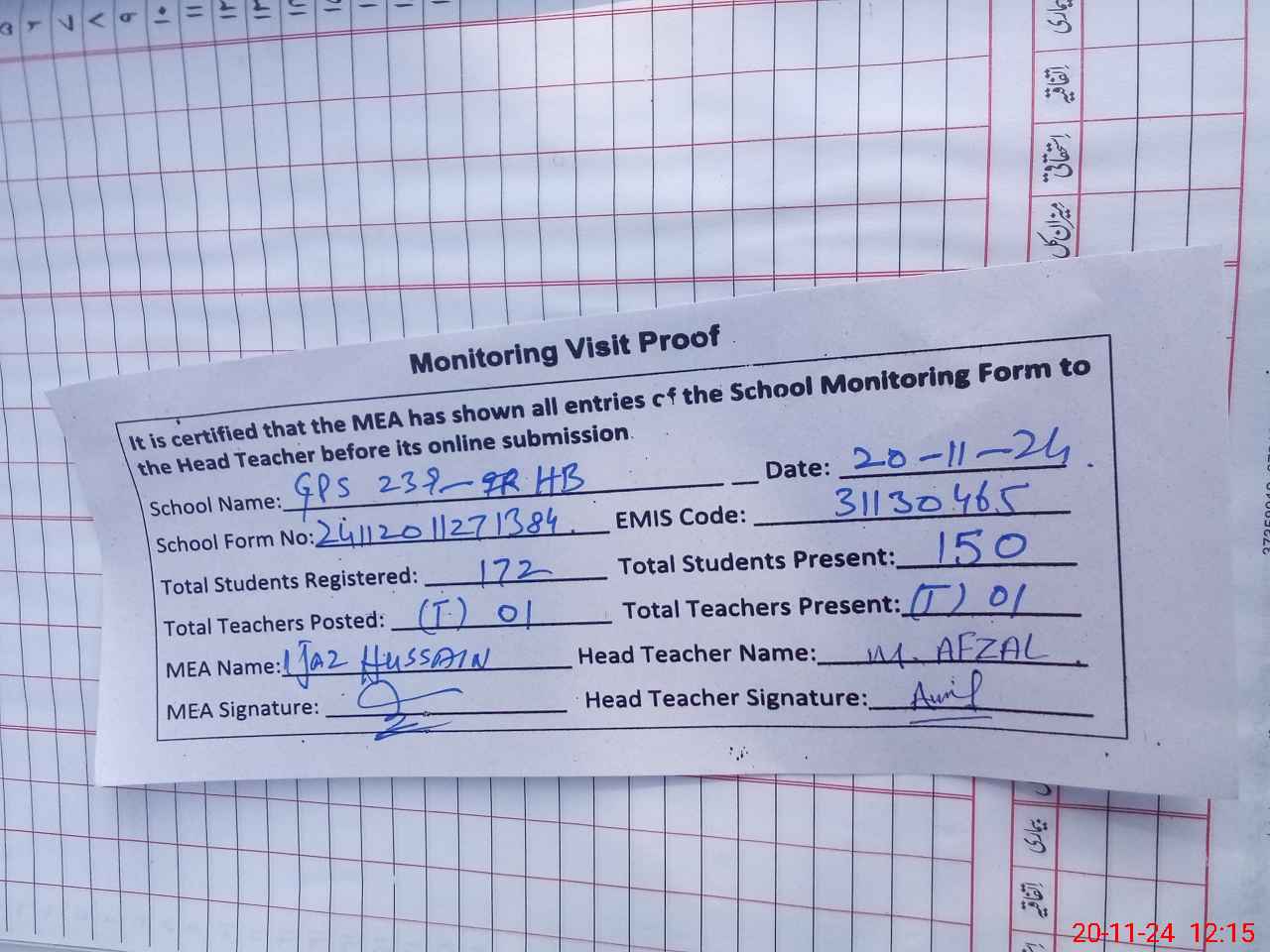 | Attendance Register | Head Teacher | MEA with School | Visit Proof |