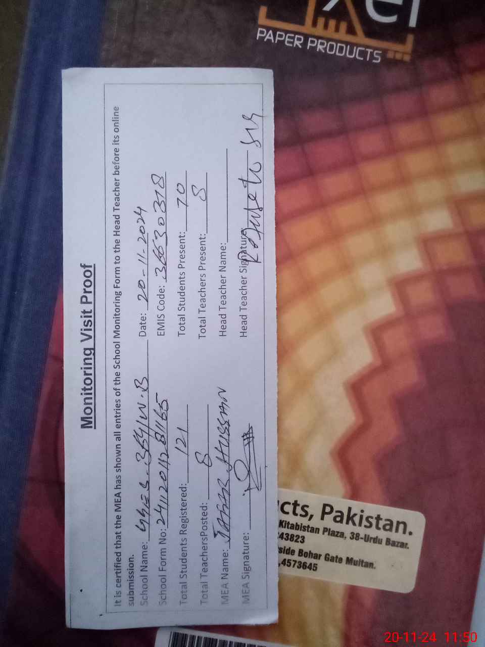 | Attendance Register | Head Teacher | MEA with School | Visit Proof |