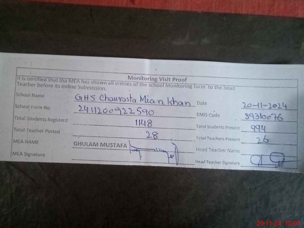 | Attendance Register | Head Teacher | MEA with School | Visit Proof |