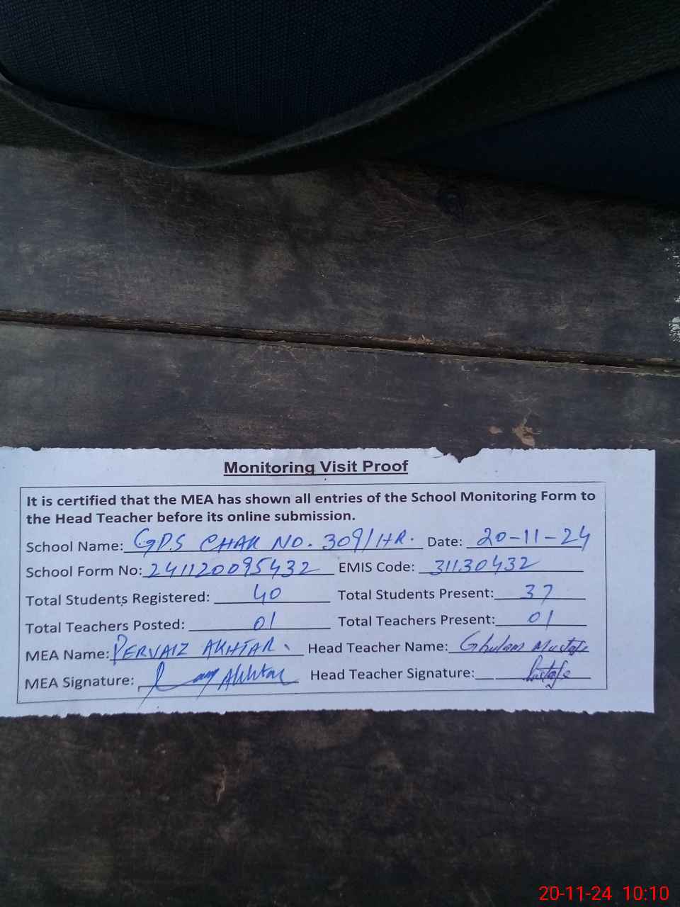 | EMIS Code: 31130432 | Name of School: GPS CHAK NO 309 HR | |||