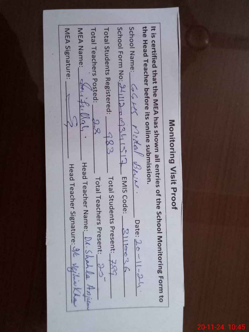 | Attendance Register | Head Teacher | MEA with School | Visit Proof |