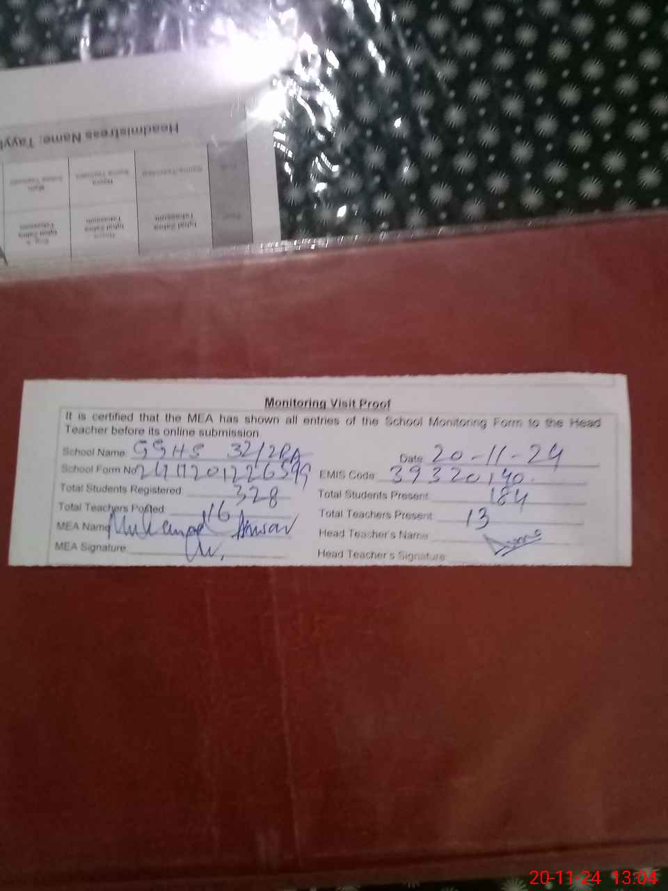 | Attendance Register | Head Teacher | MEA with School | Visit Proof |