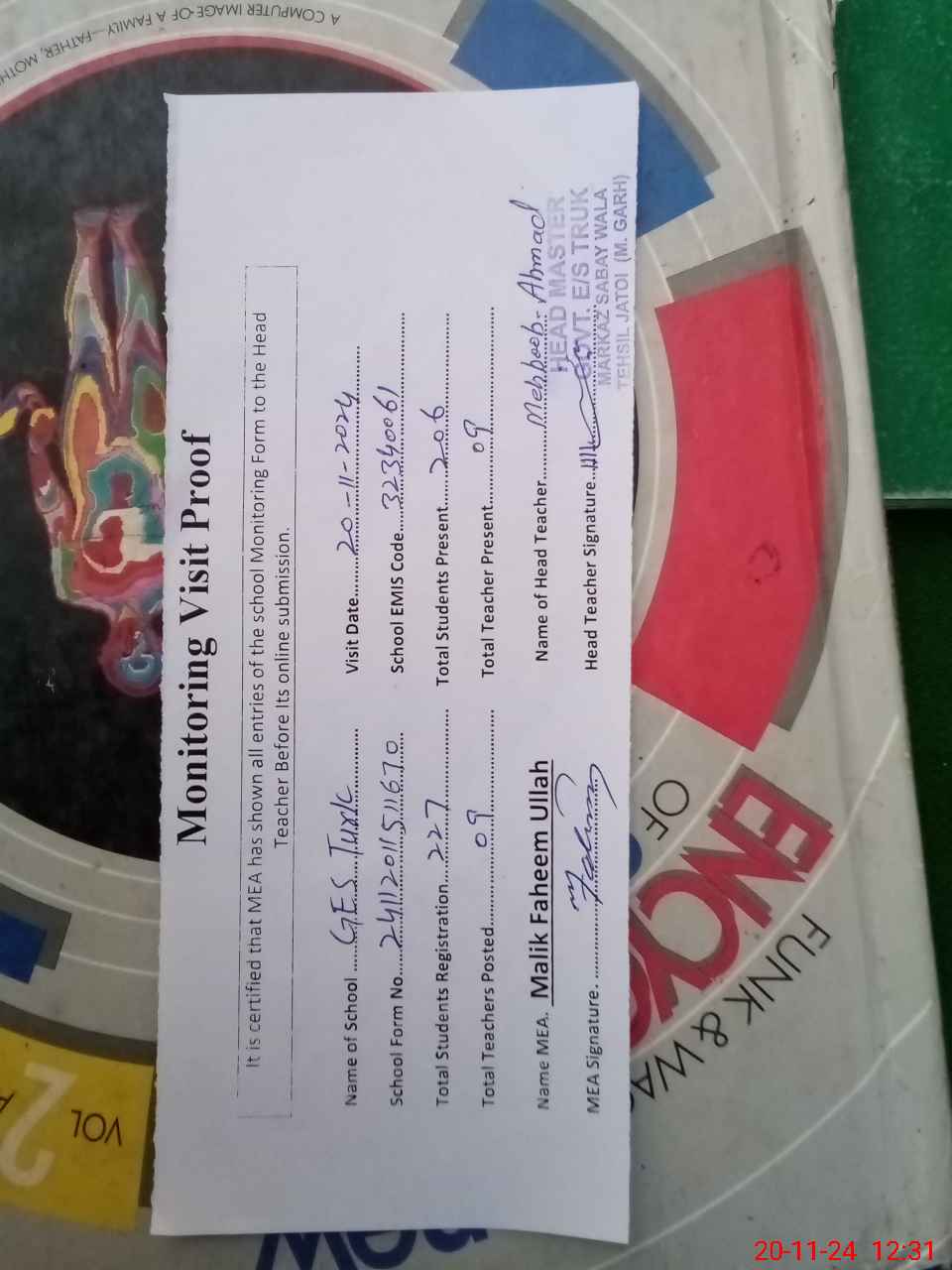 | Attendance Register | Head Teacher | MEA with School | Visit Proof |
