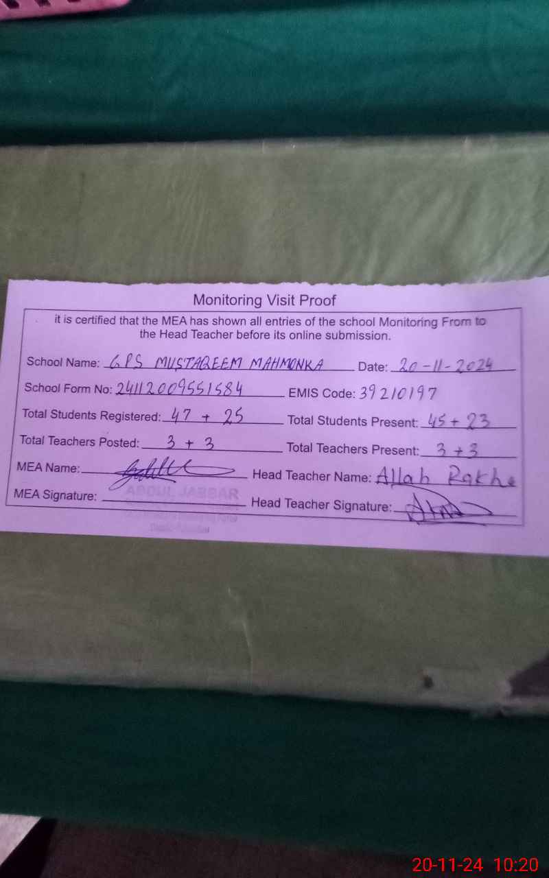 | EMIS Code: 39210197 | Name of School: GPS MUSTAQEEM MAHMONKA P/O PAKPATTAN | |||