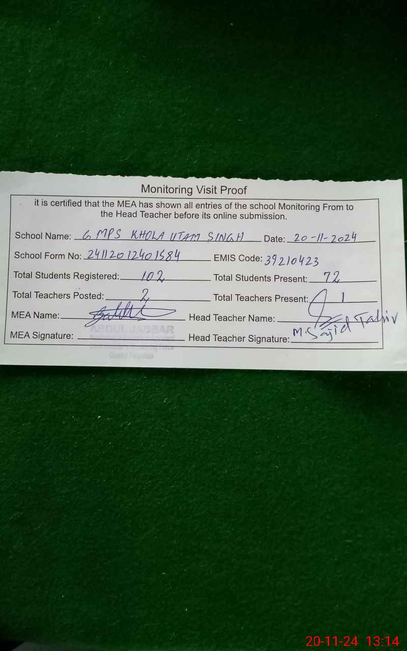 | EMIS Code: 39210423 | Name of School: GMPS KHOLA UTAM SINGH | |||