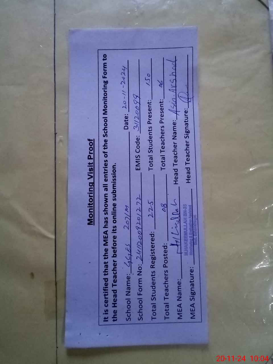 | Attendance Register | Head Teacher | MEA with School | Visit Proof |