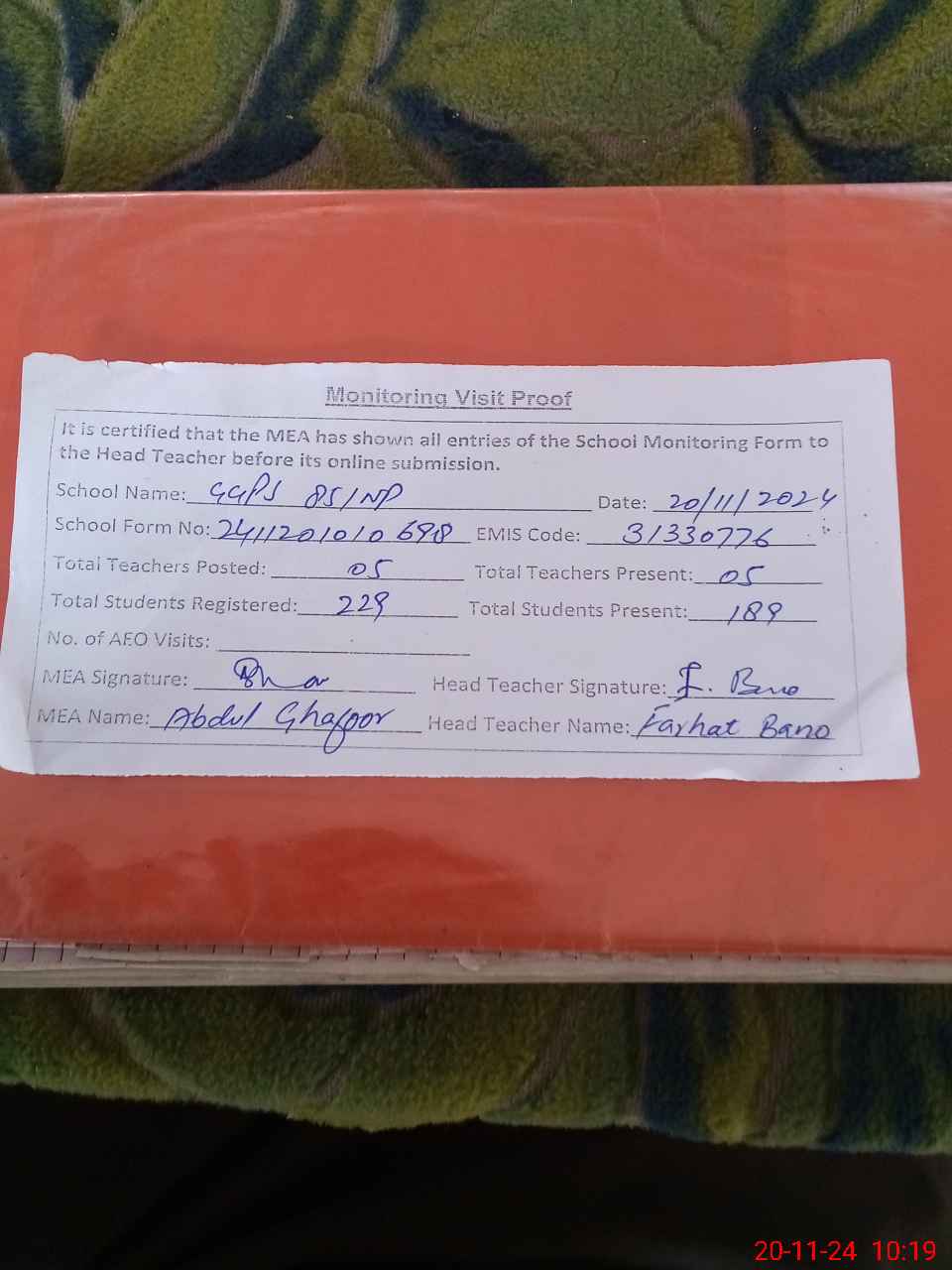| EMIS Code: 31330776 | Name of School: GGPS CHAK NO. 85/NP | |||