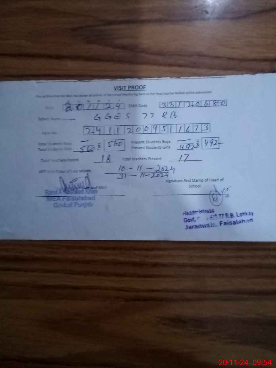 | Attendance Register | Head Teacher | MEA with School | Visit Proof |