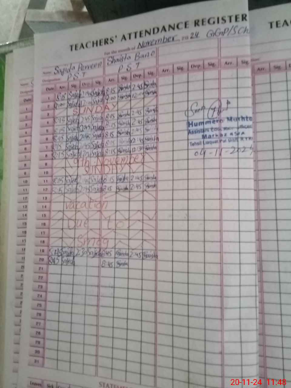 | Monitoring Date: 20-11-2024 | Start Time: 20-11-2024 11:22 AM | End Time: 20-11-2024 11:55 AM | Name of MEA: Mu**** Sa**** Ul**** Sa**** | |