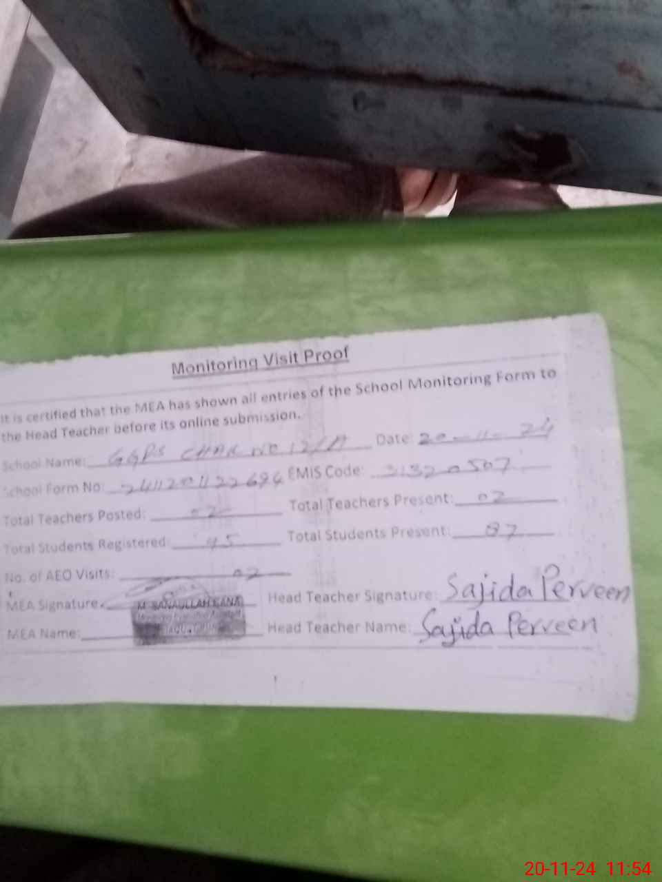 | Attendance Register | Head Teacher | MEA with School | Visit Proof |