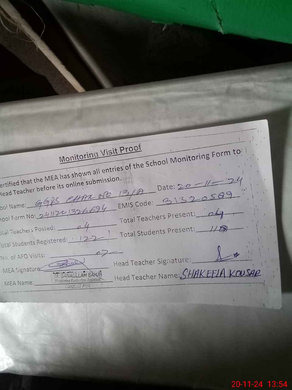 | Attendance Register | Head Teacher | MEA with School | Visit Proof |
