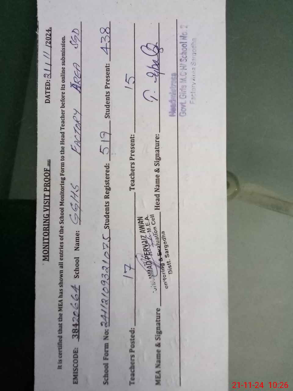 | EMIS Code: 38420664 | Name of School: GGHS FACTORY AREA SARGODHA | |||