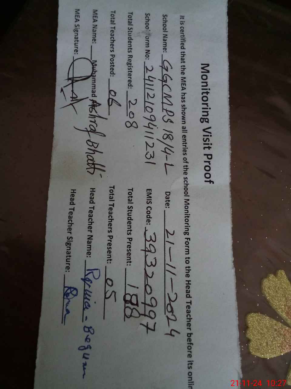 | Attendance Register | Head Teacher | MEA with School | Visit Proof |