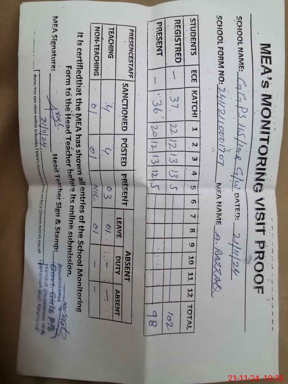 | Attendance Register | Head Teacher | MEA with School | Visit Proof |