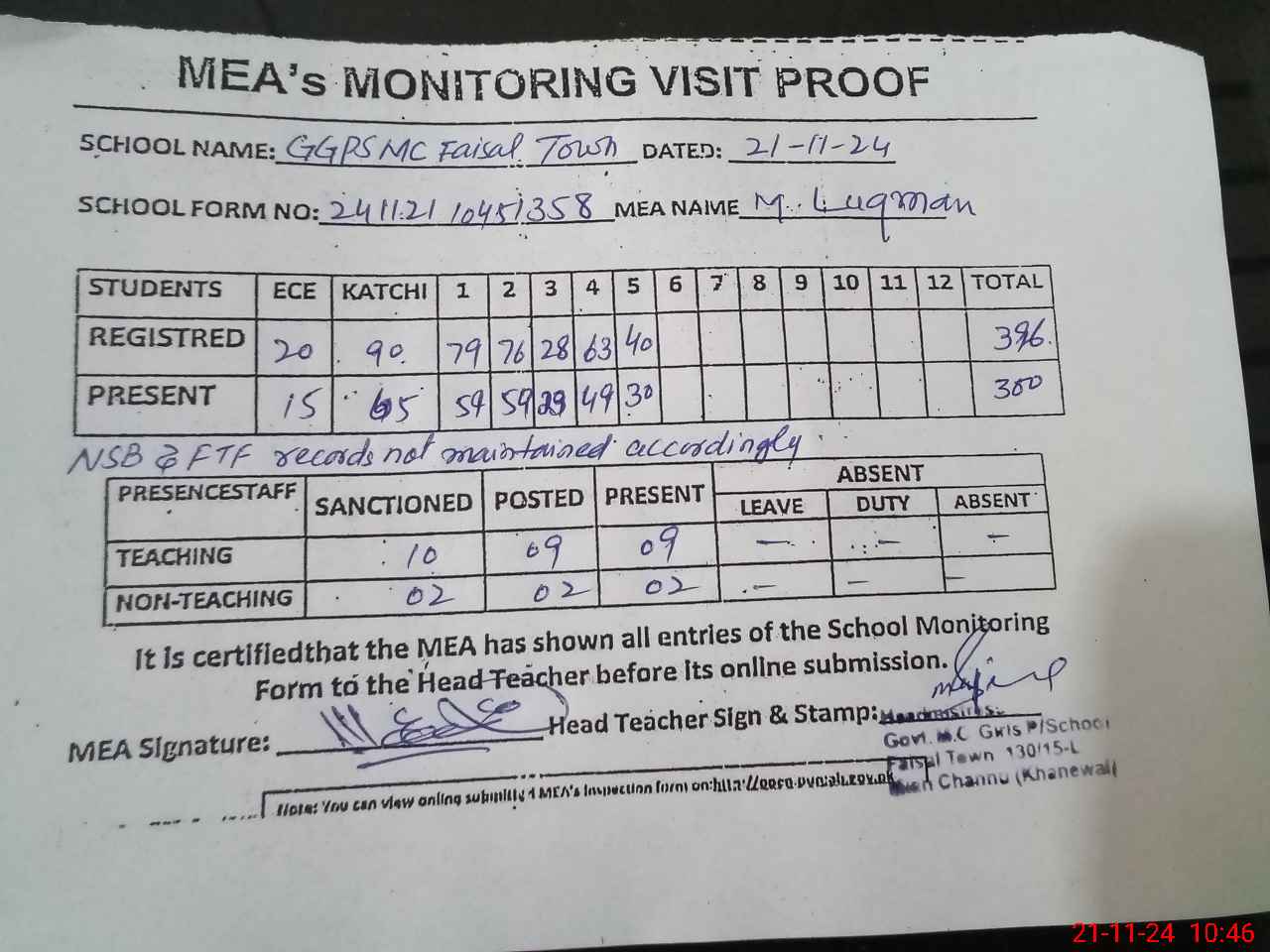 | EMIS Code: 36430275 | Name of School: GGPS MC 130/15-L FAISAL TOWN, MIAN CHANNU | |||