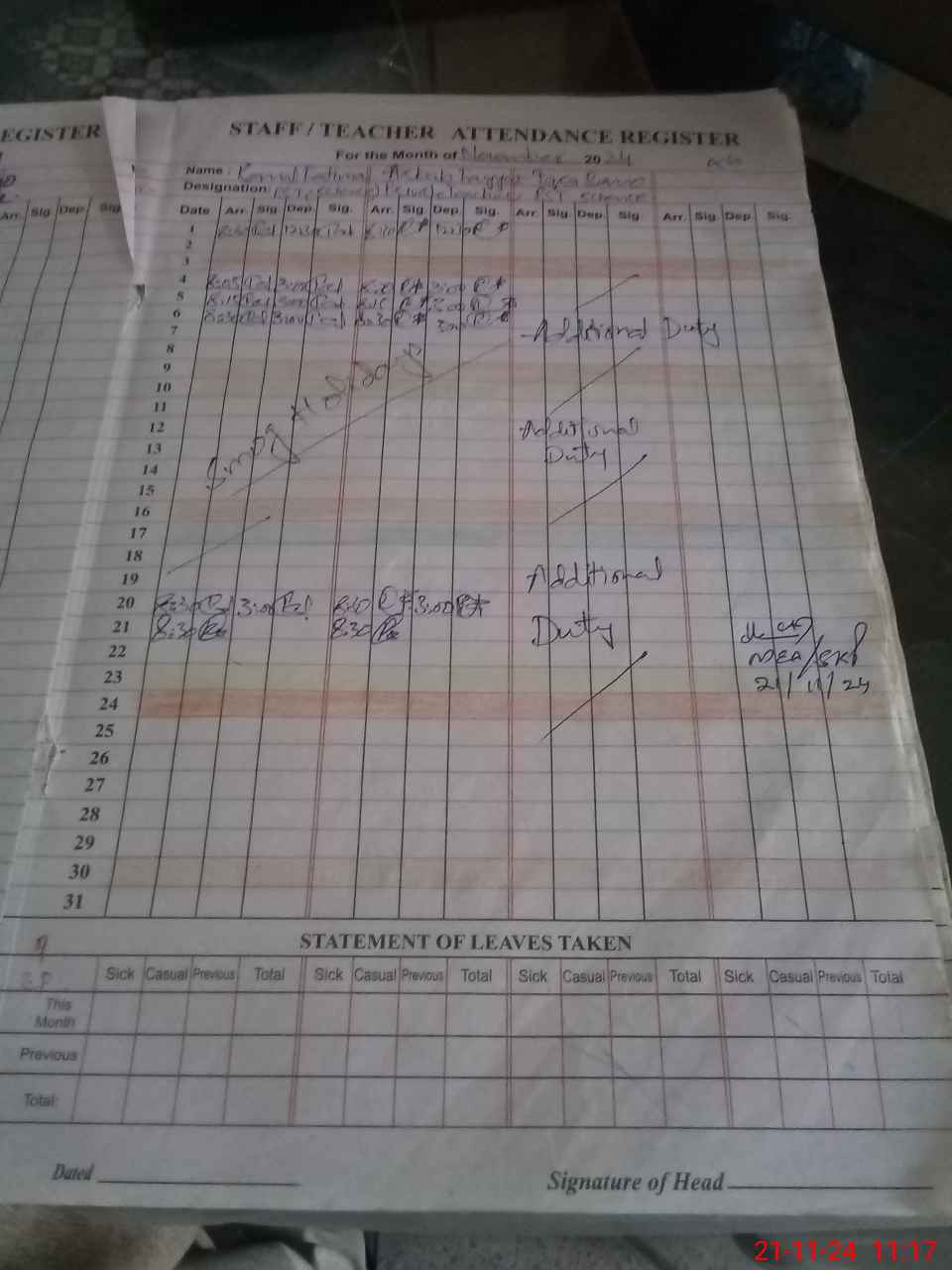 | Leave | Duty | Absent | Maternity | Medical | Ex- Pak |