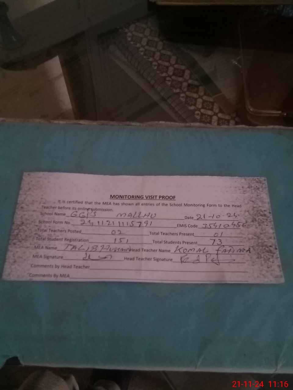 | Attendance Register | Head Teacher | MEA with School | Visit Proof |