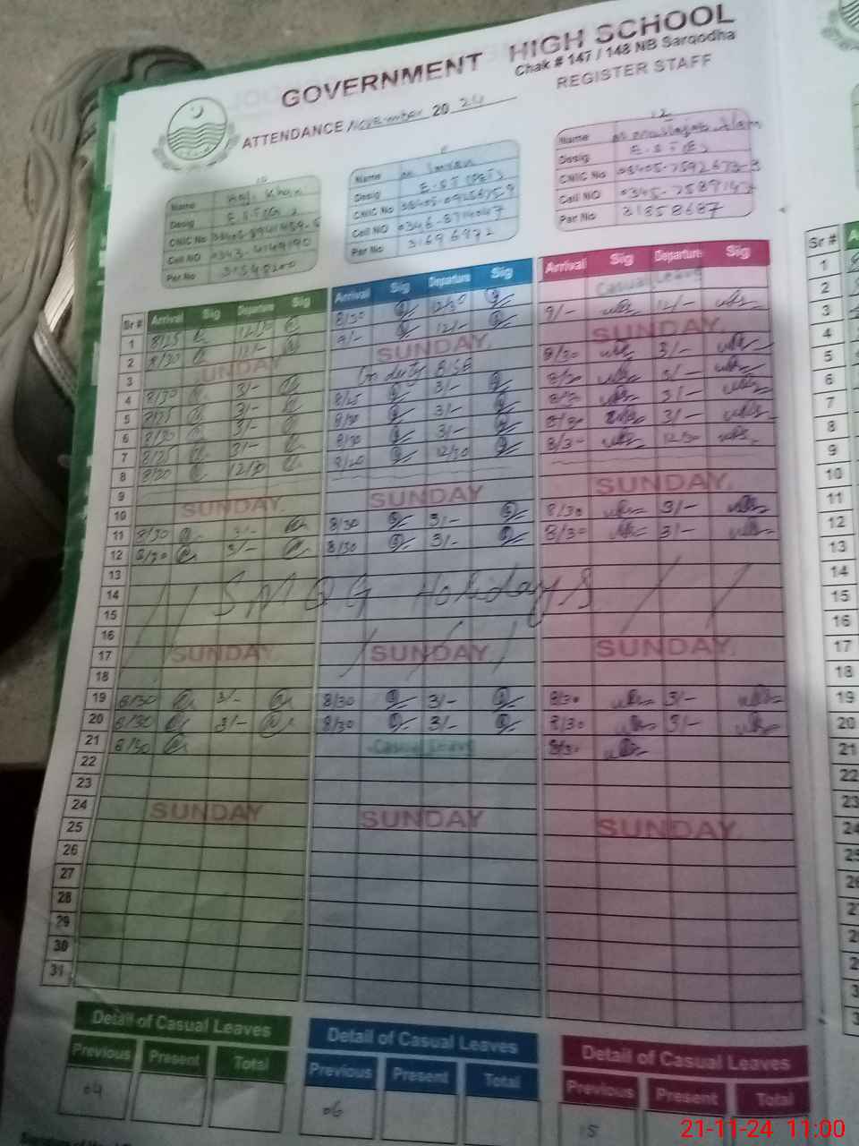 | CNIC | Full Name | Designation | R/C | Absence during last cal. month |
