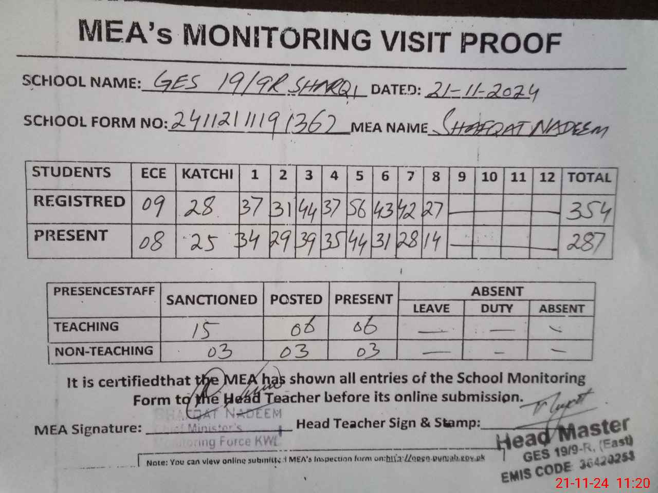 | Attendance Register | Head Teacher | MEA with School | Visit Proof |