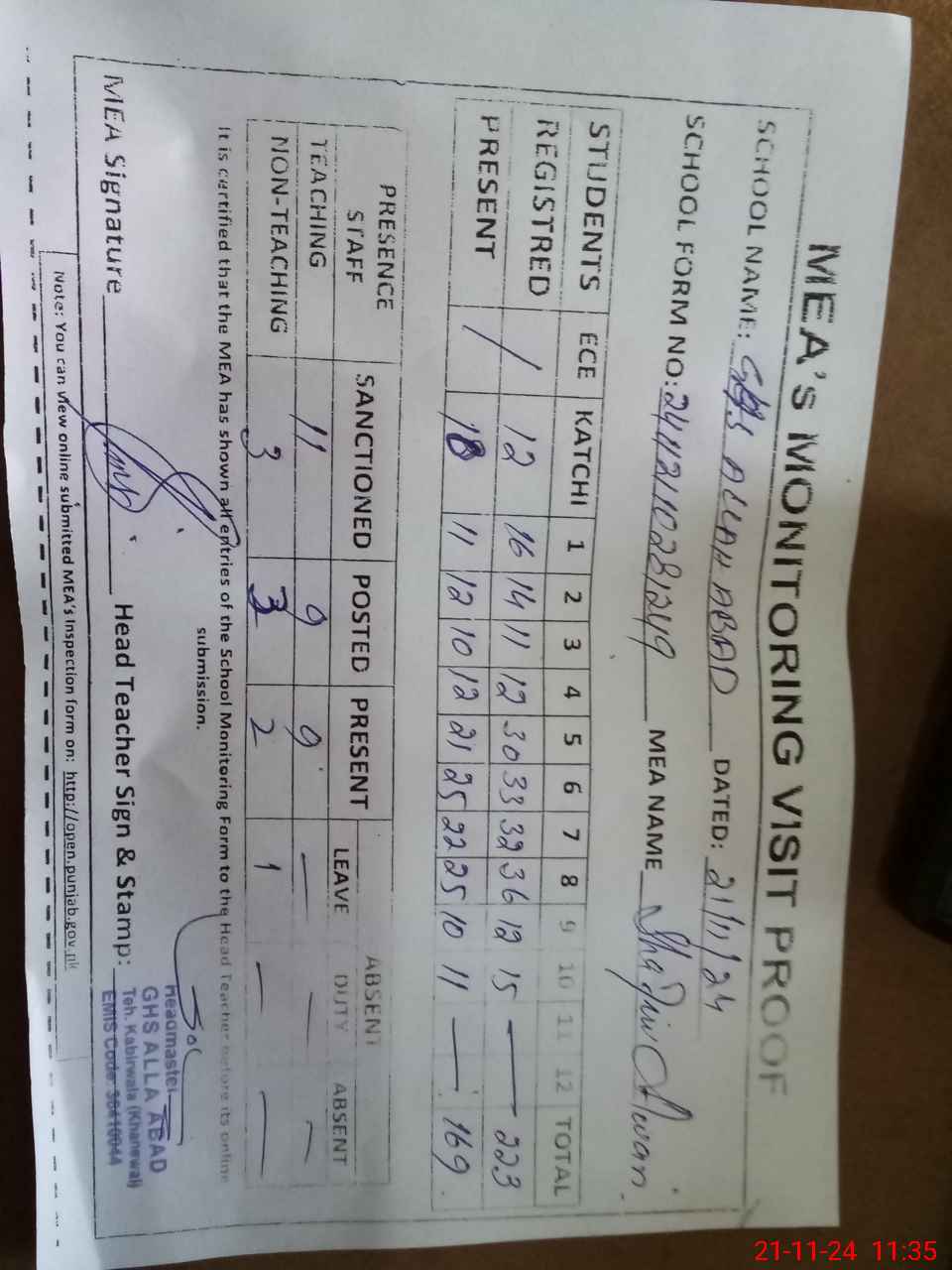 | EMIS Code: 36410044 | Name of School: GHS ALLAH ABAD, KABIRWALA | |||