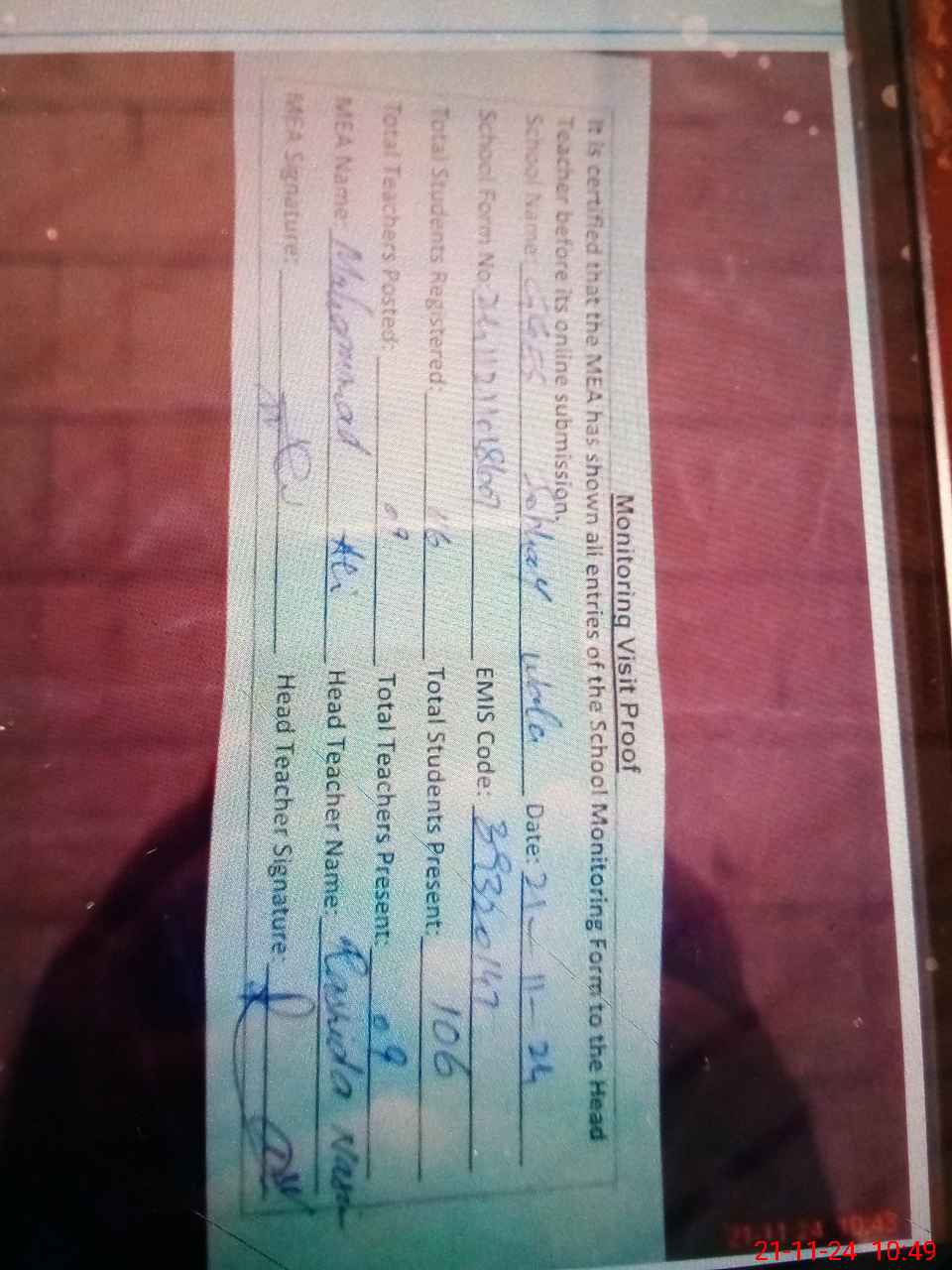 | Attendance Register | Head Teacher | MEA with School | Visit Proof |