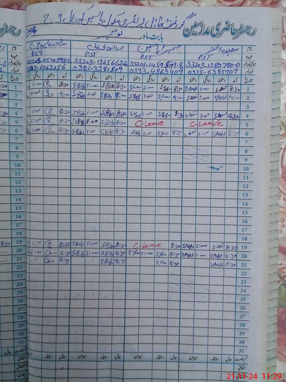 | CNIC | Full Name | Designation | R/C | Absence During Last Calender Month |