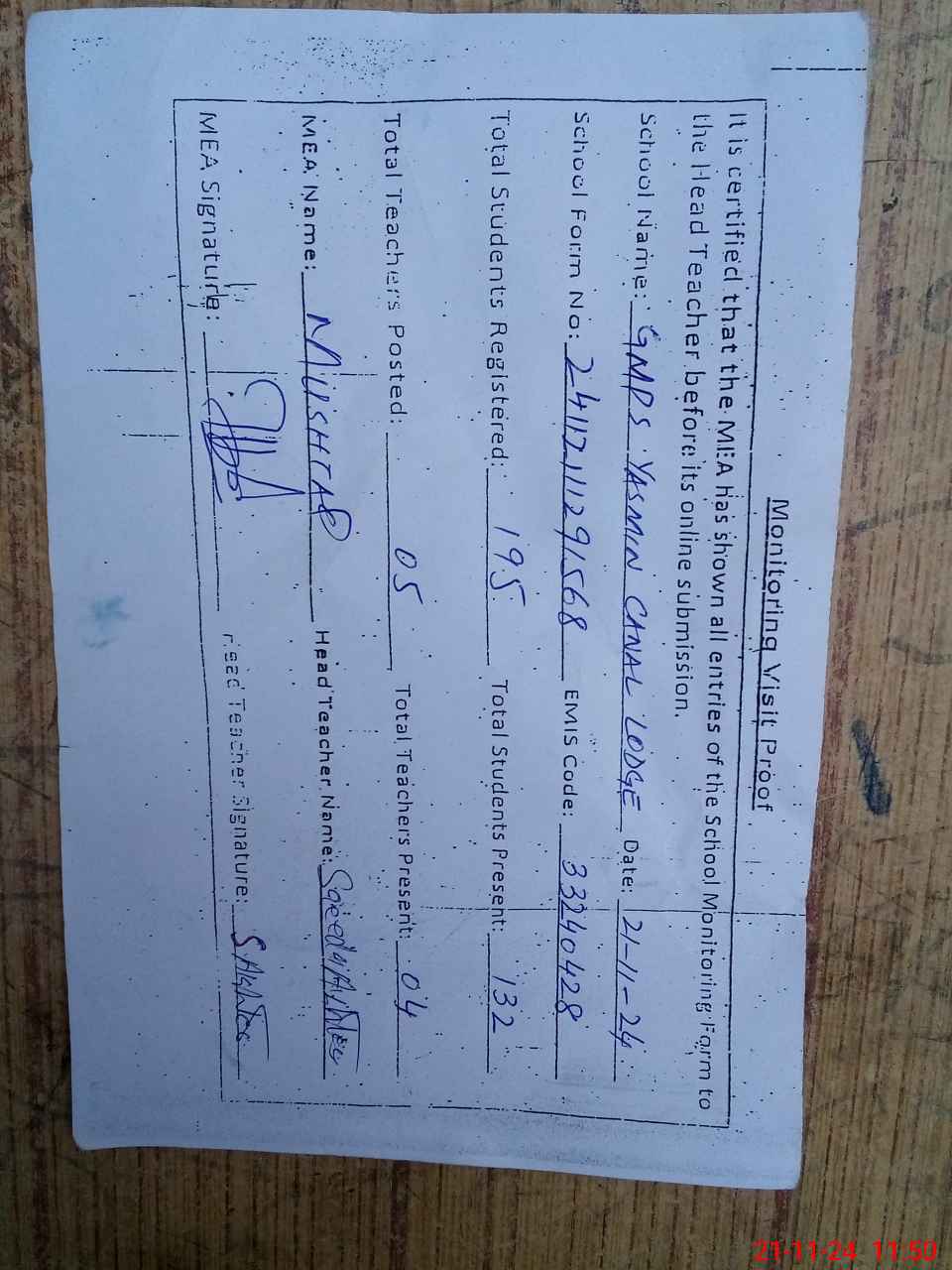 | Attendance Register | Head Teacher | MEA with School | Visit Proof |