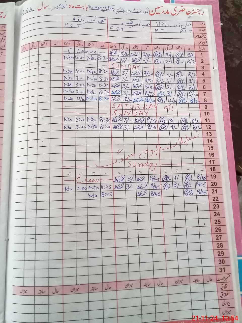 | CNIC | Full Name | Designation | R/C | Absence During Last Calender Month |