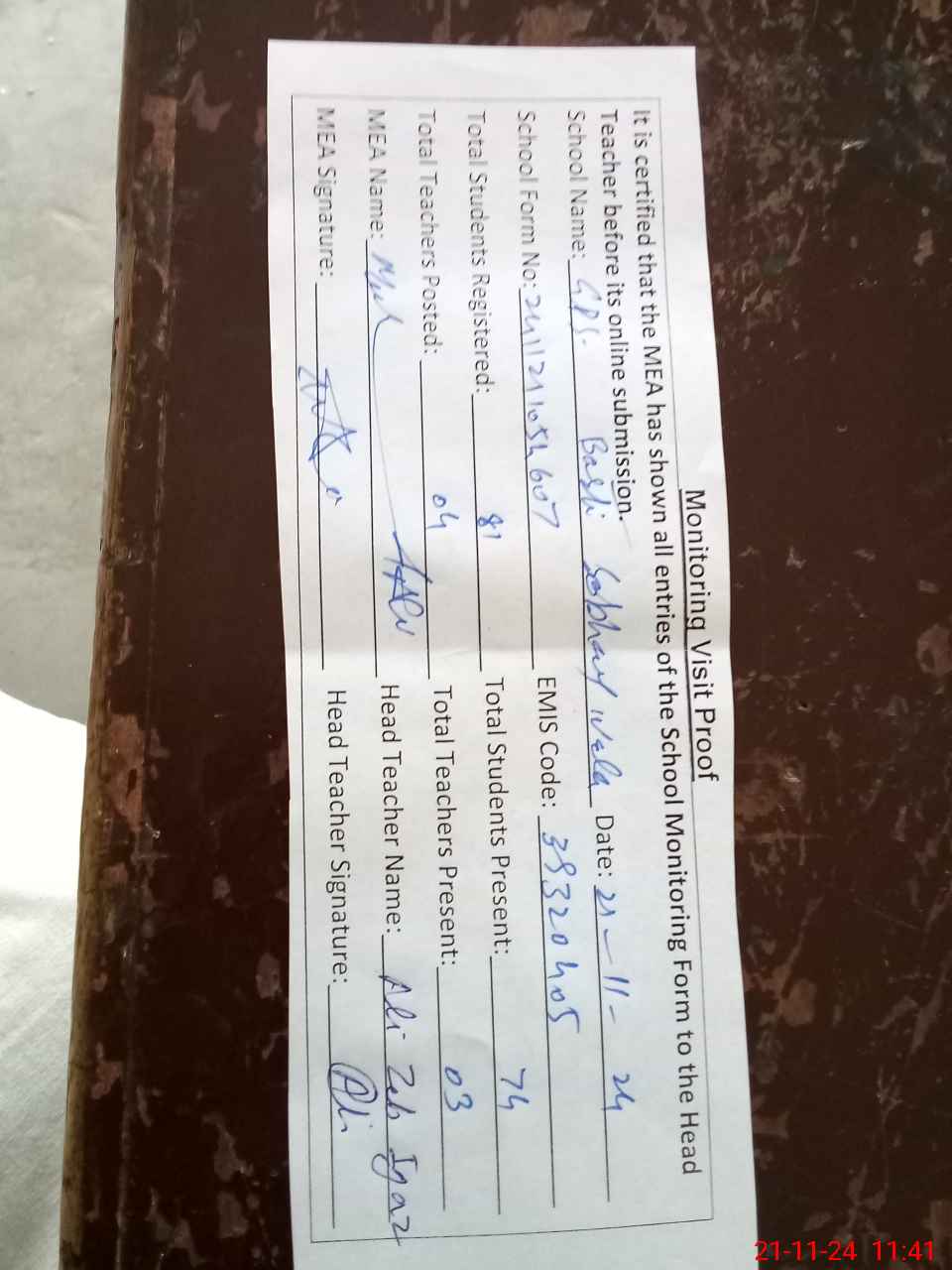 | Attendance Register | Head Teacher | MEA with School | Visit Proof |