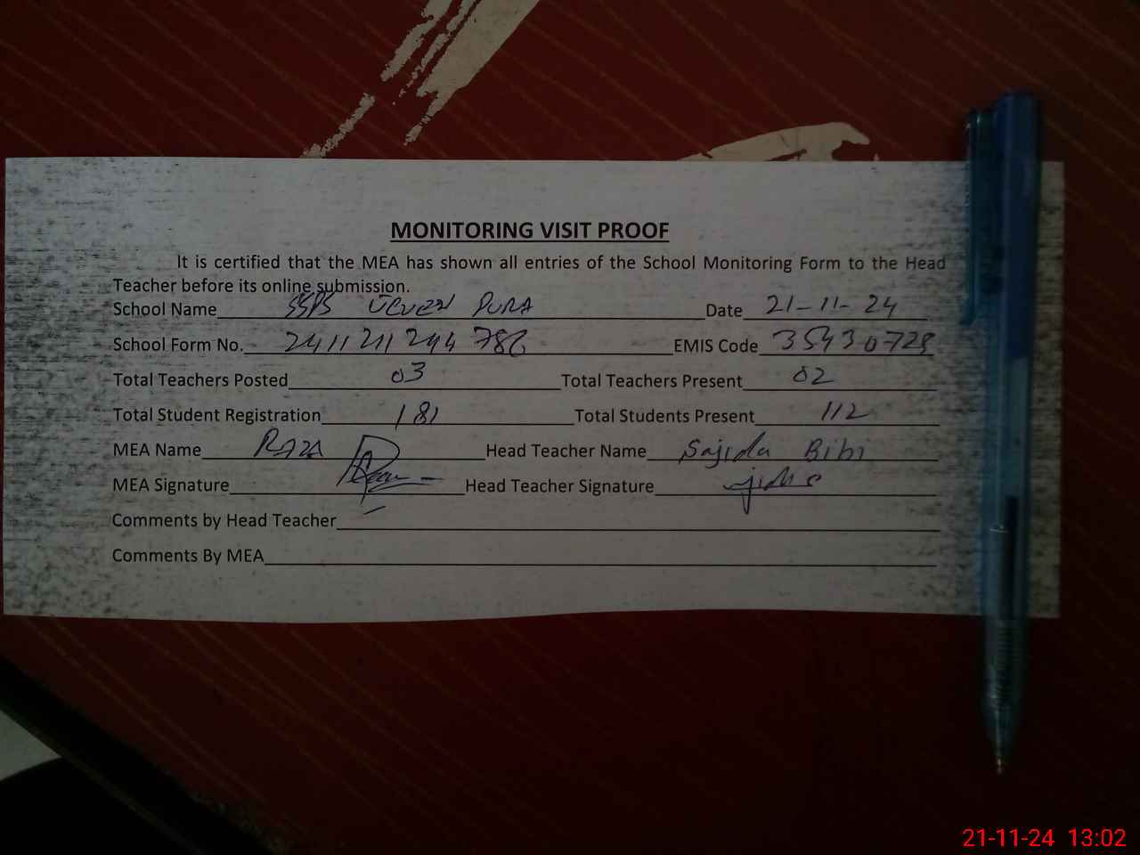 | Attendance Register | Head Teacher | MEA with School | Visit Proof |