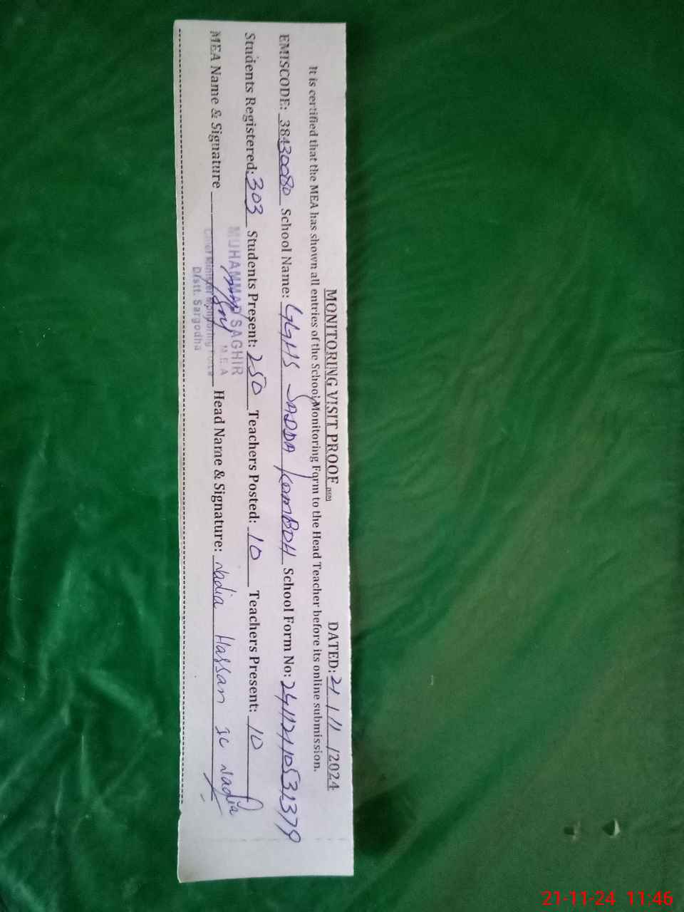 | EMIS Code: 38430080 | Name of School: GGHS SADA KAMBOH | |||