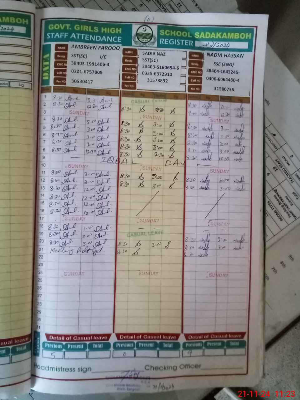 | CNIC | Full Name | Designation | R/C | Absence During Last Calender Month |