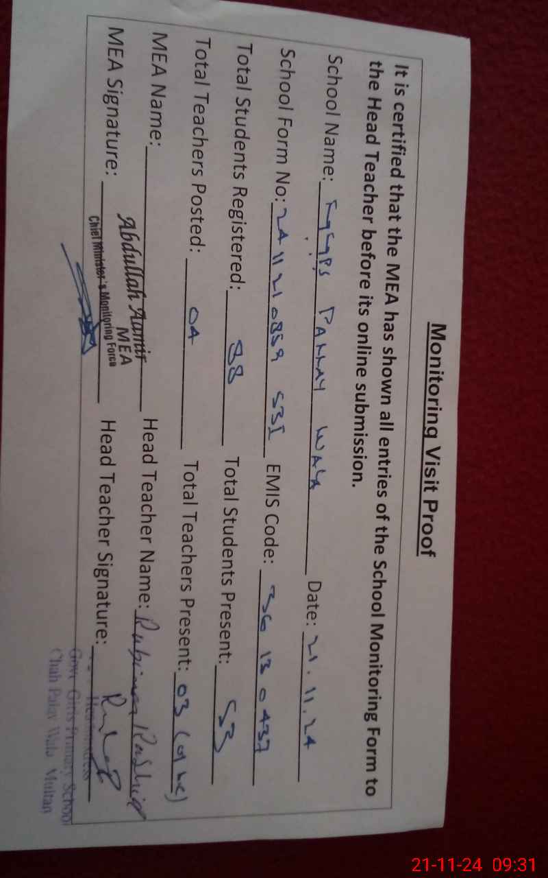 | Attendance Register | Head Teacher | MEA with School | Visit Proof |