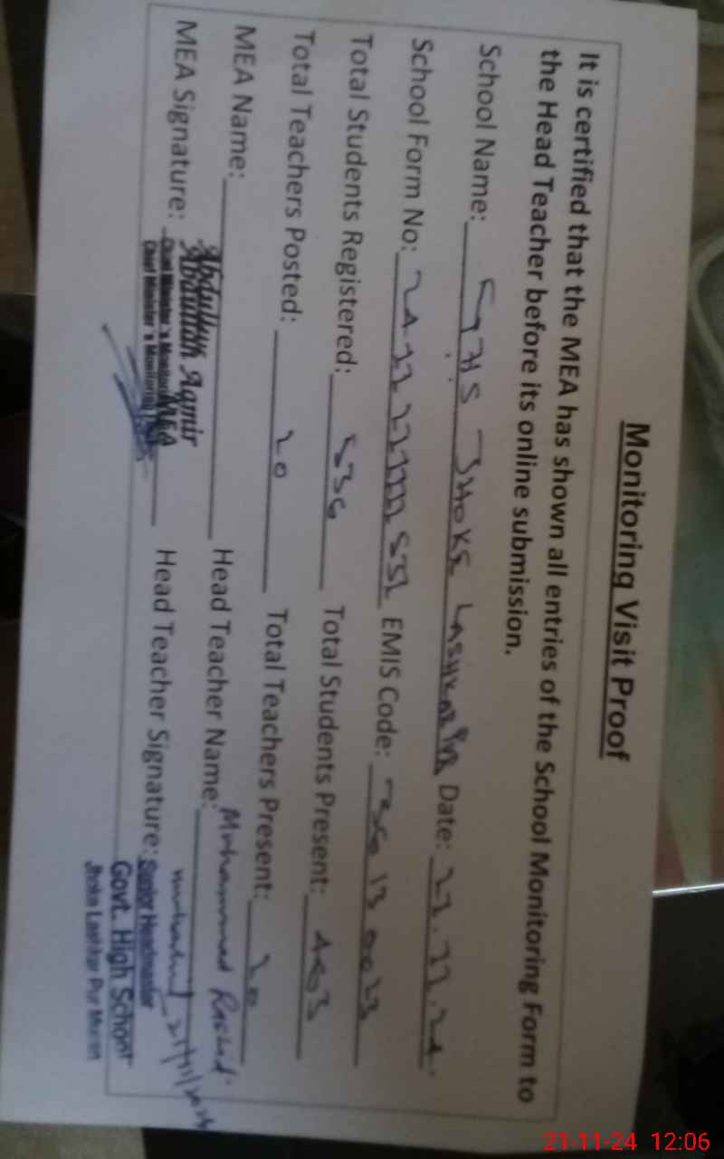 | Attendance Register | Head Teacher | MEA with School | Visit Proof |