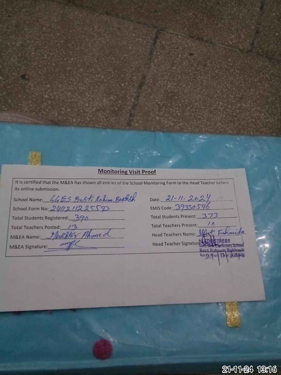| Attendance Register | Head Teacher | MEA with School | Visit Proof |