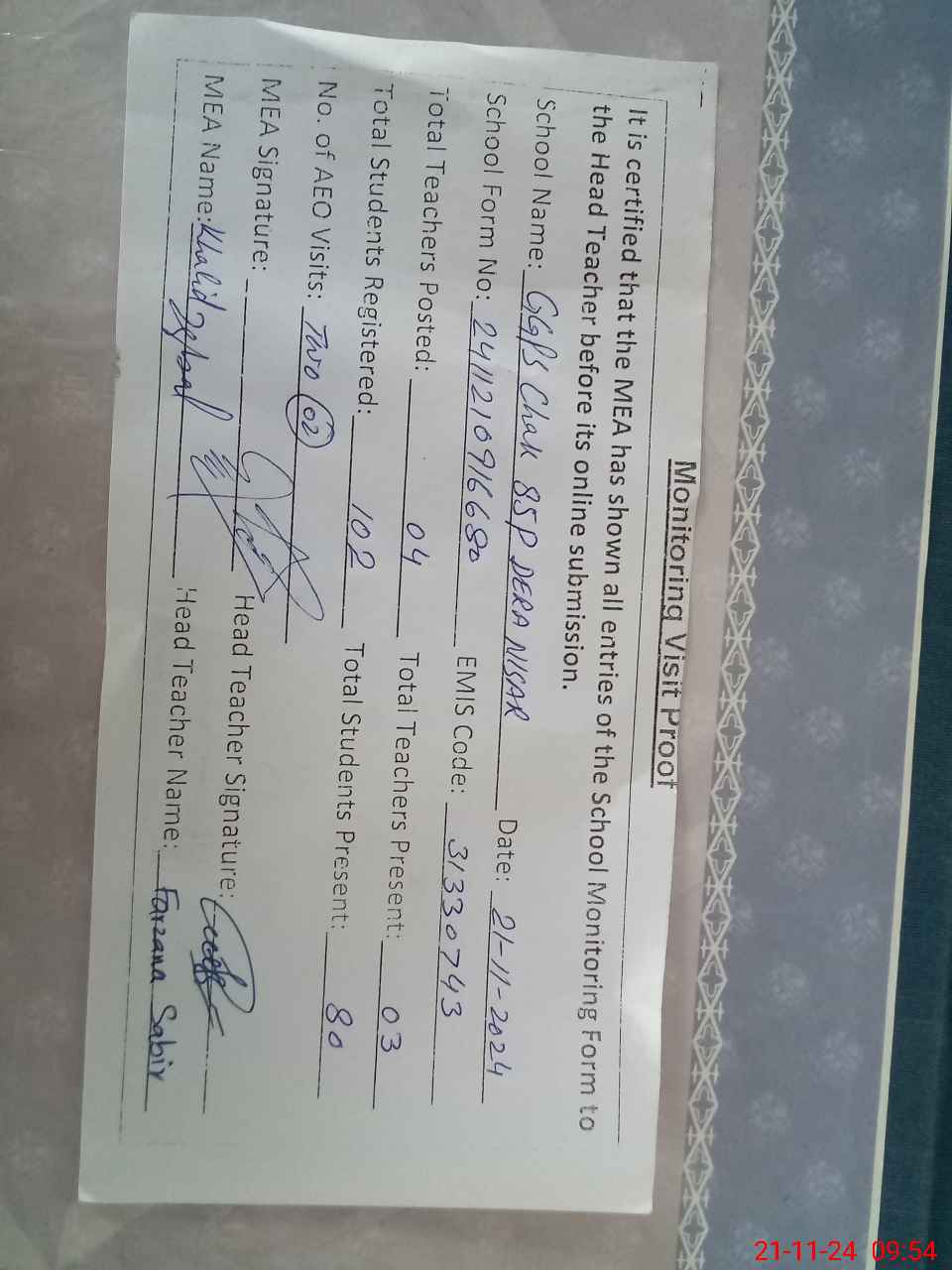| EMIS Code: 31330743 | Name of School: GGPS CHAK 85/P DERA NISAR | |||