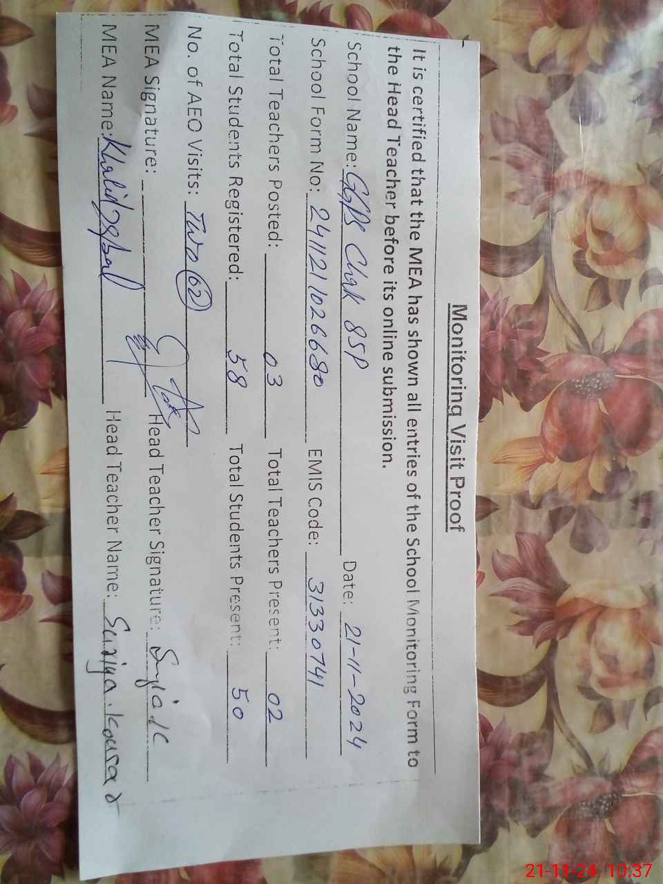 | Attendance Register | Head Teacher | MEA with School | Visit Proof |